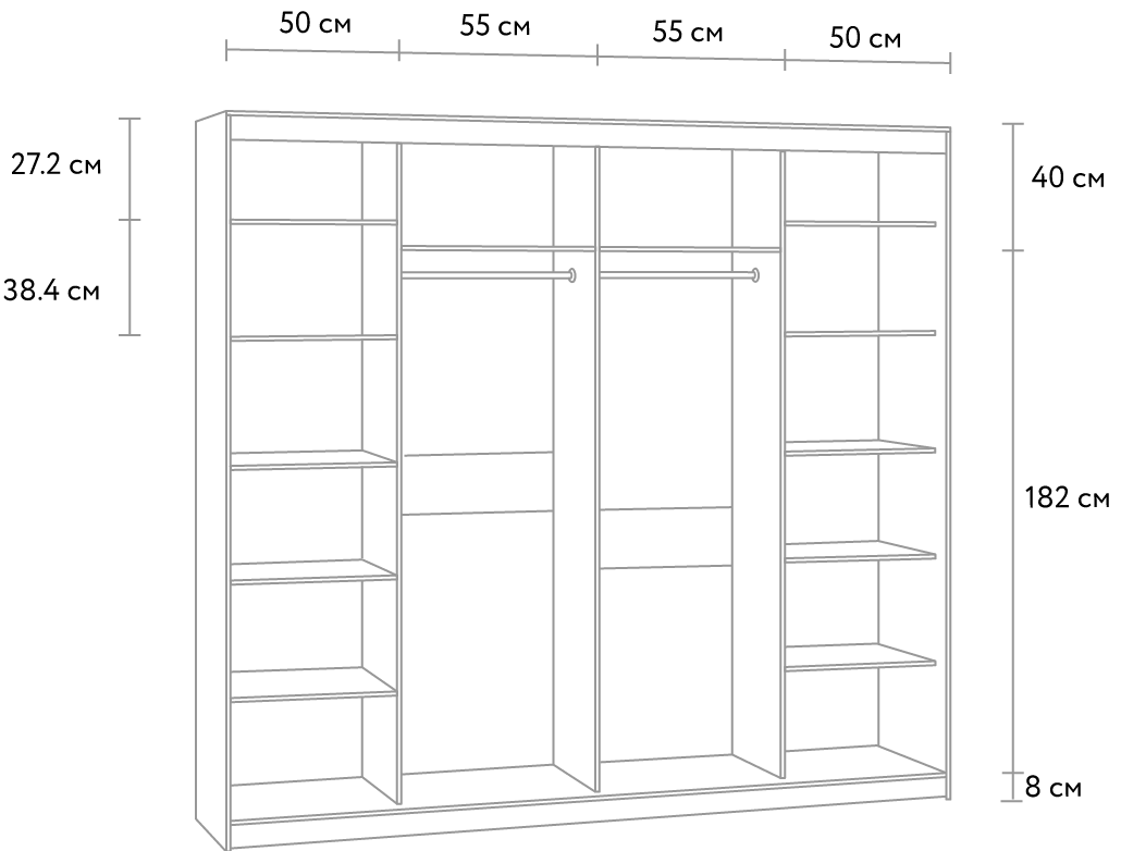 Төрт есікті "Тебар" шкафы-киімді ретке келтіруге ыңғайлы жүйе. Қатты өлшемдері мен жоғары сыйымдылығының арқасында ол үлкен отбасының гардеробын оңай орналастырады. Шкафтың дизайнында сөрелер мен штангалар бар, ал қасбеті үлкен айнамен безендірілген, онда сіз өзіңізді толық көлемде көре аласыз. Есіктердің артында сіз ойластырылған ішкі толтыруды күтесіз. Ал щетка таспасының болуы шкафтың ішіне шаңның түсуіне жол бермейді және қақпақтардың үнсіз ашылуын және жабылуын қамтамасыз етеді (бұл элемент өнімнің негізгі жиынтығына кірмейді және бөлек сатып алынады).