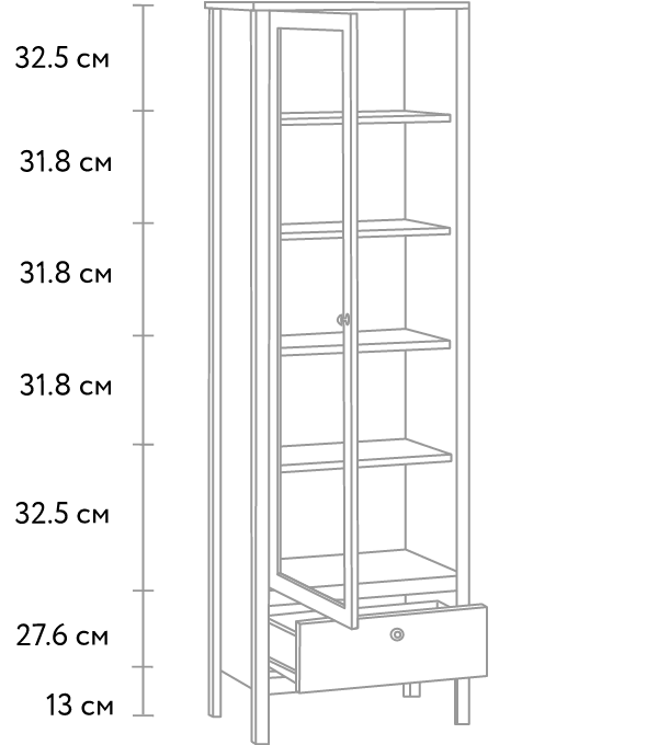 Витрина МДФ және ДСП – ұзақ қызмет етуге арналған берік тозуға төзімді материалдардан жасалған. Металл тұтқалар тек сенімді аппараттық құрал ғана емес, сонымен қатар стильді, екпін элементі болып табылады. Модель жоғары талғампаз аяқтарда орналасқан, сондықтан жиһазды жылжытпай тазалау оңайырақ.