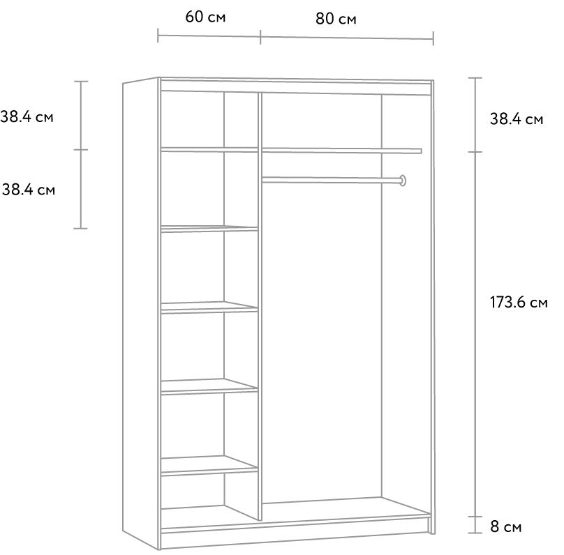 Габаритная глубина шкафа больше внутренней глубины на 7 см за счет внешней навески дверей. Лента-щетка входит в комплект.